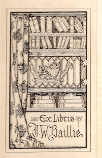One of the nicest ex libris I found was this attractive pictorial to J.W. Ballie. I have a feeling it's a British bookplate, not Canadian, but I suppose one can always hope. Preliminary research hasn't turned up any biographical details, but there appears to be a distinctive artist mark in the lower left corner of the bookplate. Anyone have any idea who the artist could be?The next bookplate is a nice little late Victorian/early Edwardian era label for Allan Turner of Brockville, Ontario. Similarly, I did a quick search on him and turned up a few interesting facts. An entrepreneur, his father settled in Brockville around the 1850s and was later involved in the development for waterworks and rail interests for the city, and also appears to at one time have been involved in a Supreme Court of Canada case concerning imports and exports. Allan himself appears to have taken a medical education and at one time operated the chemist and druggist shop on Brockville's main street.